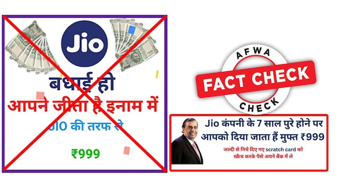 এক ঝলকে এই অফার দেখে আসল মনে হবে। সেখানে রয়েছে একটি স্ক্র্যাচ কার্ড। যেখানে একটি Jio-র লোগো দেখা যাচ্ছে। সঙ্গে রয়েছে মুকেশ আম্বানির ছবি। কার্ডে লেখা রয়েছে সবে 7 বছর পূর্ণ করেছে জিও। এই উপলক্ষে 999 টাকার নিশ্চিত উপহার দেওয়া হচ্ছে। এই জন্য আপনাকে কার্ড স্ক্র্যাচ করতে হবে এবং ভাগ্যবান বিজেতা 999 টাকা উপহার পাবেন।